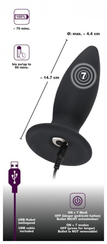 Пробка имеет 7 различных режимов вибрации, при помощи которых, Вы испытаете совершенно новые анальные ощущения и максимально расслабите анальную зону перед половым актом! Мощная вибрация проникает в каждую клеточку и идеально отвлекает от дискомфорта