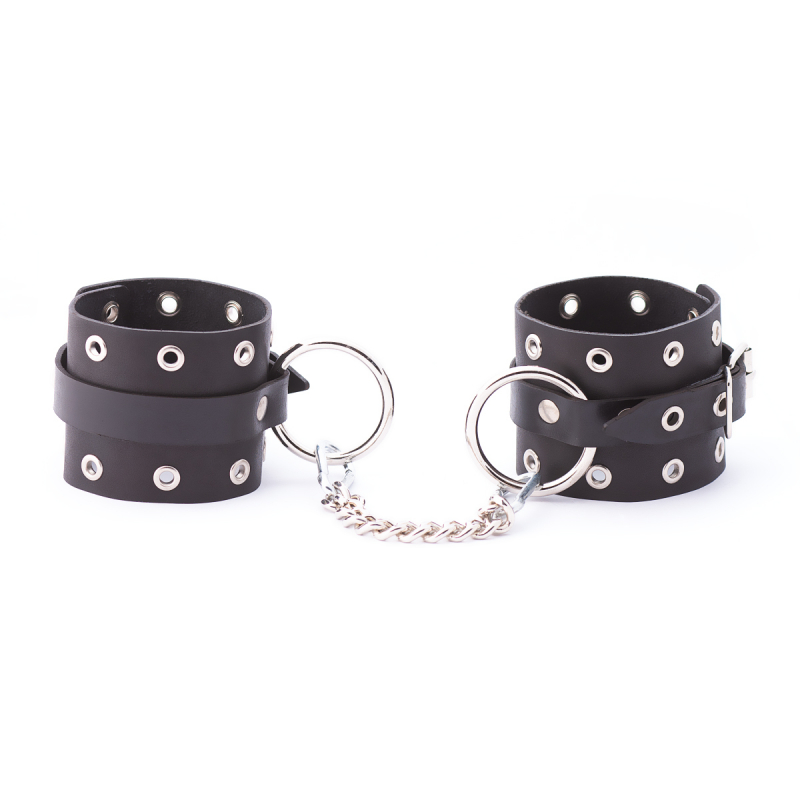 Выполнены оковы из натуральной кожи в черном цвете и декорированы люверсами и металлическими клепками