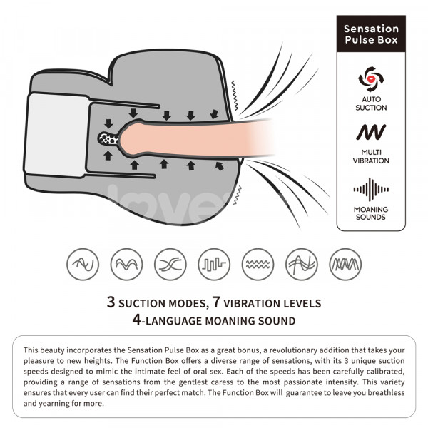 Мастурбатор имеет 7 разнообразных режимов вибрации, 3 режима вакуума и голосовое сопровождение на 4 языках!